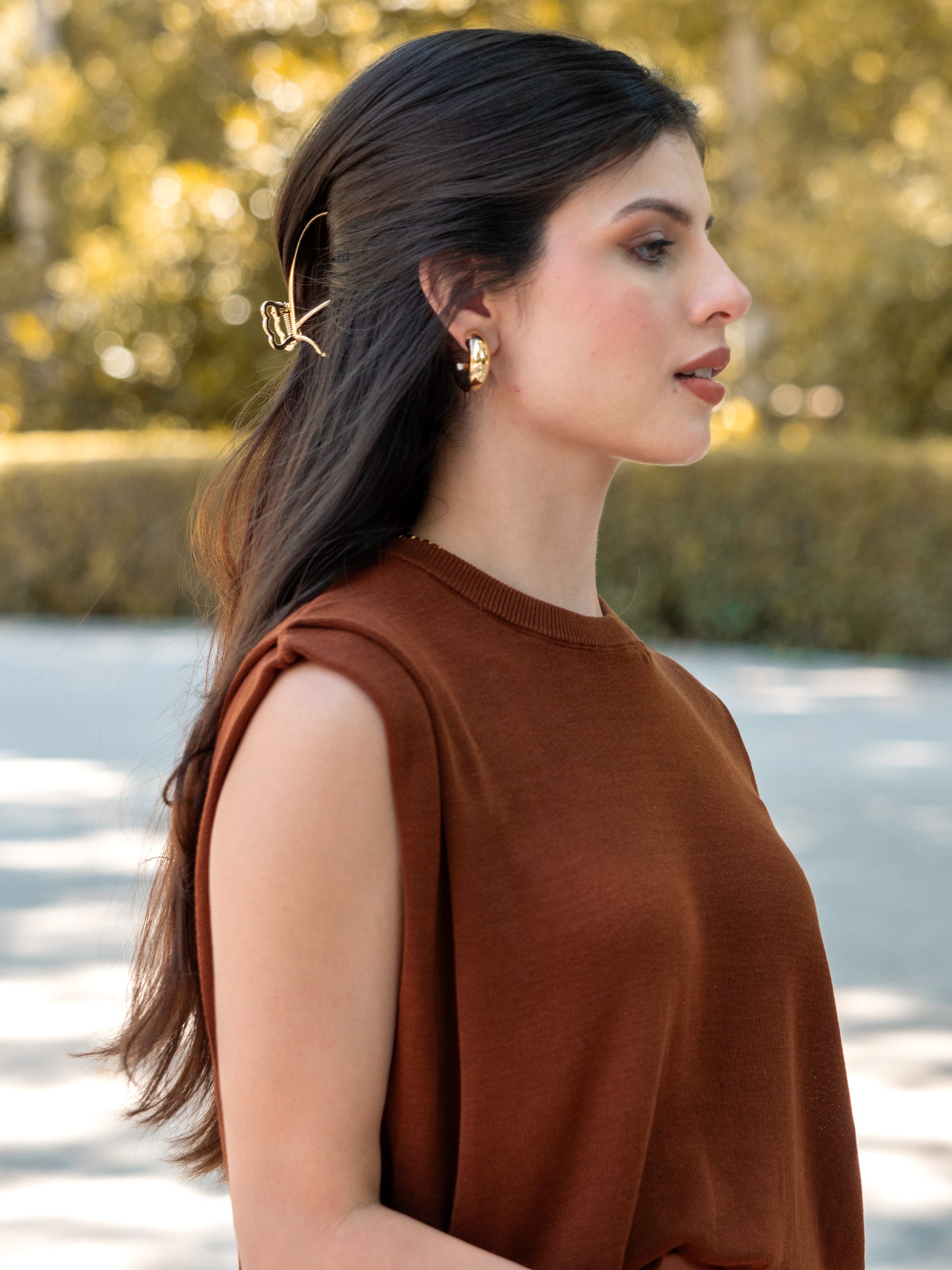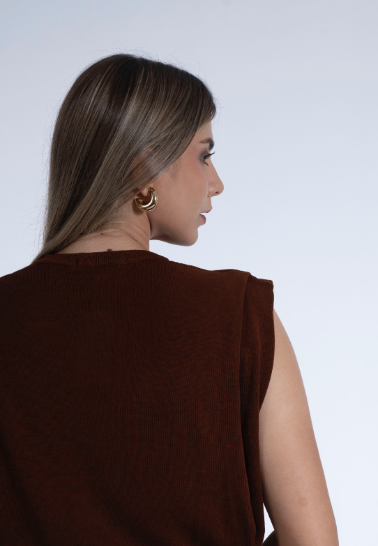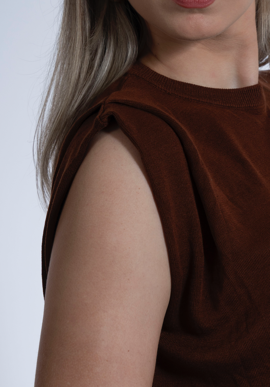 The Mocaccino top is a copper-colored knit blouse with advanced breathability technology for a polished and striking look. The gathered shoulders add a trendy touch, while the ribbed waist ensures a perfect fit.